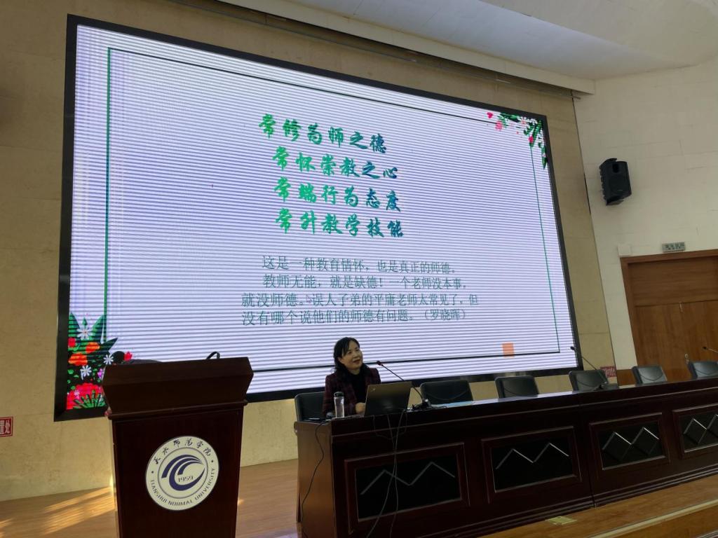1月5日下午和晚上,甘肃省特级教师、中学正高级教师、天水市逸夫实验中学副董事长马佩霞作了题为“明明白白学做语文教师”的专题讲座。马佩霞老师从“有业”“敬业”“乐业”三个方面阐述了教师的意义和价值,传授了自己学做语文老师的经验,为广大师范员工从教提供了行动指南。