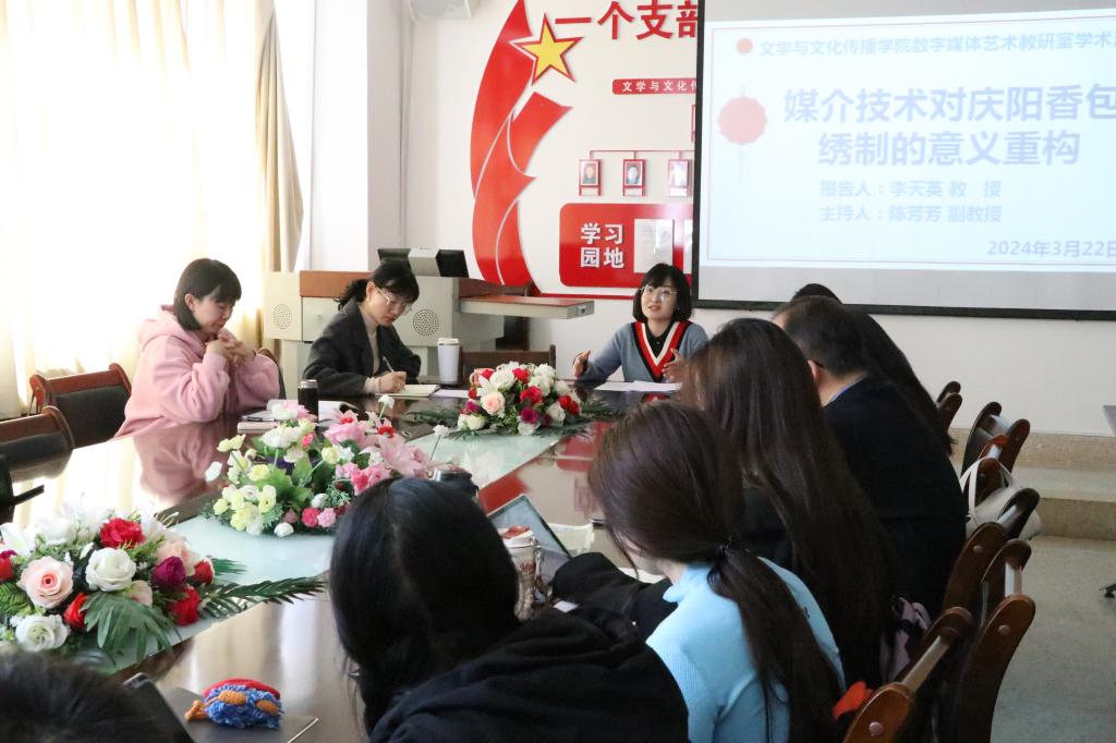 李天英教授作了题为《媒介技术对庆阳香包绣制的意义重构》的报告。她指出,庆阳香包绣制是我国非物质文化遗产之一,值得珍视、保护、传承和开发。随后依次探讨了庆阳香包绣制的属性及“给予表达”、媒介技术介入后庆阳香包“流露”表达的新倾向、庆阳香包被媒介技术增强的“流露”表达以及媒介技术对庆阳香包绣制意义重构的必然性。李天英教授表示,随着互联网的普及和传播媒介的不断丰富,媒介技术使庆阳香包绣制焕发出了新的生机,也为其创新性发展带来了新的机遇。因此,应从内容生产和受众反馈两个层面,充分利用媒介技术和“视觉判断”原理,让接受者在选择性的观赏中为“品”“美”“韵”“情”赋予更多的内涵和意义。
