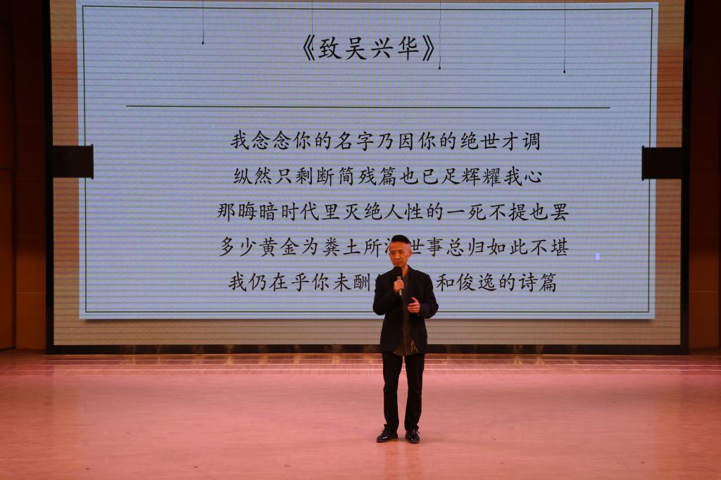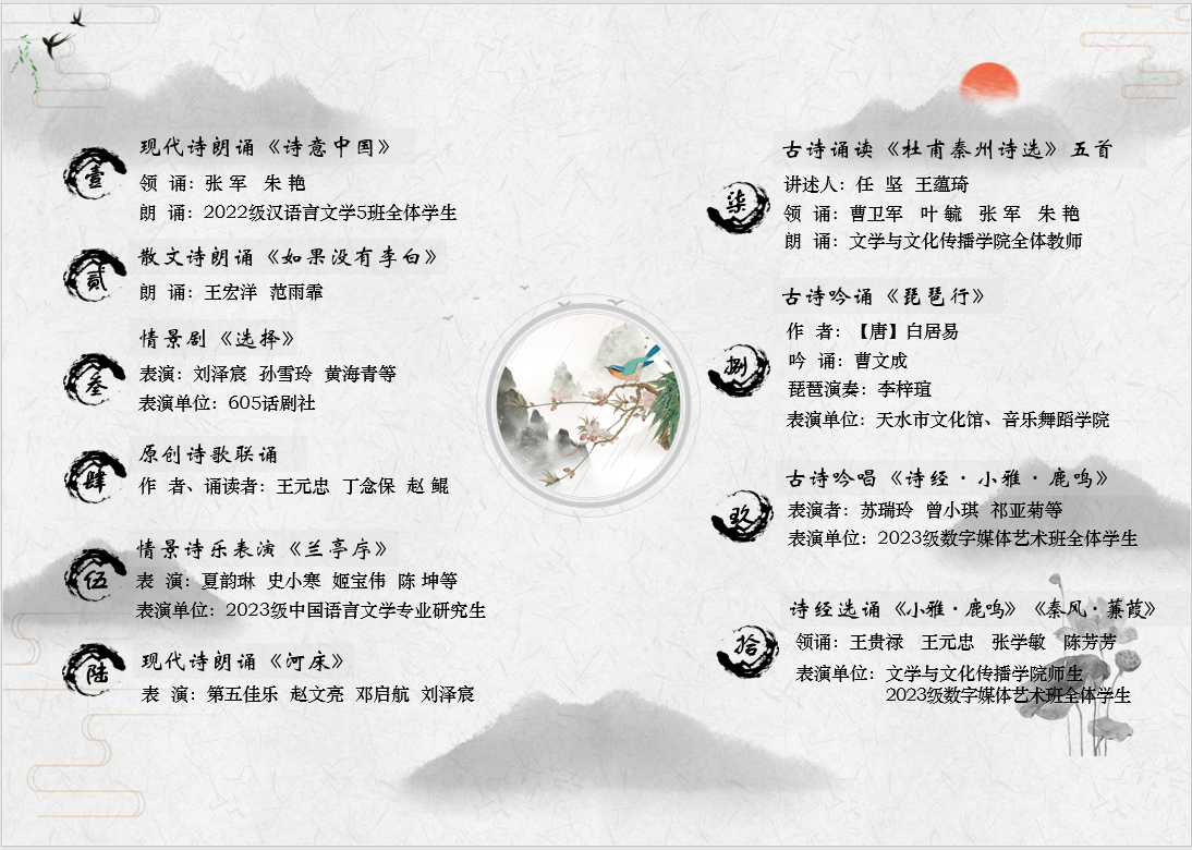 伟德师生精心排练和准备的文艺节目有:张军、朱艳带领2022级汉语言文学5班全体员工朗诵的《诗意中国》;任坚、曹卫军、叶毓、张军、朱艳、王蕴琦以及全院教职工集体诵读的杜甫秦州诗五首;王元忠、丁念保、赵鲲带来的原创诗歌联诵《下雪天组词或造句》、《双蝶记》、《致吴兴华》;员工王宏洋、范雨霏的朗诵《如果没有李白》;2023级汉语言文学专业研究生带来的情景诗乐《兰亭序》;员工赵文亮、第五佳乐等带来的现代诗朗诵《河床》;2023级数字媒体艺术一班带来的诗词吟唱《诗经·小雅·鹿鸣》;王贵禄、王元忠、张学敏、陈芳芳带领全场师生诵读的《鹿鸣》、《蒹葭》等。