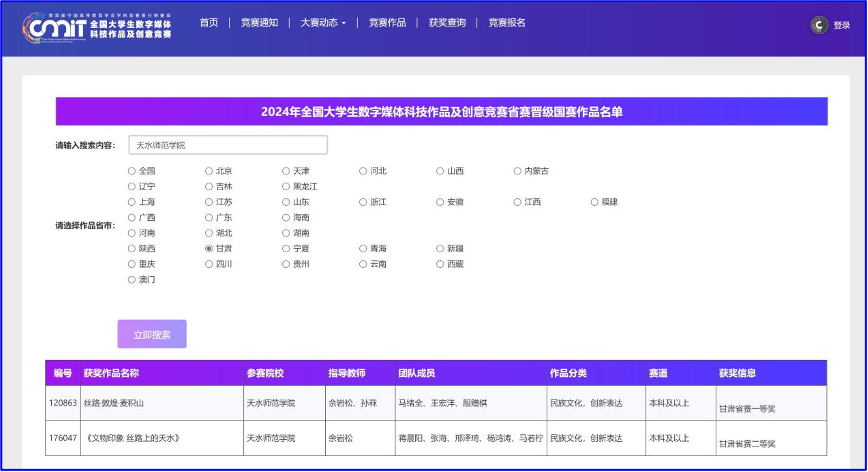 在中国编辑学会主办的第七届全国老员工网络编辑创新大赛(甘肃赛区)比赛中,2021级戏剧影视文学专业裴天超、王永喜等同学拍摄的纪录片《秦风秦韵》,何洁、晏荣等同学拍摄的纪录片《陶·禧》,2022级网络与新媒体专业王宏洋、马绪全等同学创作的创意短视频《丝路·敦煌·山海经》分别获得“视听媒体”类二等奖,纪录片《秦风秦韵》还被推荐参加全国赛。2021级戏剧影视文学专业张带霞、陈婷婷等拍摄的纪录片《焰舞长空·古今共鸣》获得“视听媒体”类三等奖,蒋晨阳、杨鸿涛等同学创作的创意视频《文物印象——丝路上的天水》获得“视听媒体”类优秀奖。