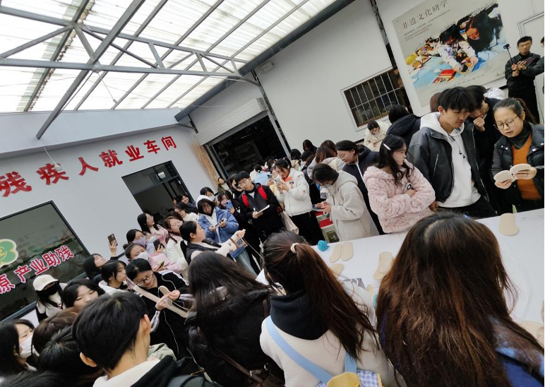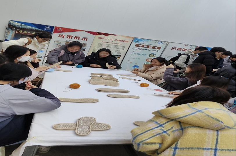 在麻鞋厂,同学们首先参观了生产车间。麻鞋厂设计师详细介绍了制作麻鞋的原材料、工具以及丰富多样的成品。在成品展示区,设计师深入讲解了麻鞋设计理念,包括传统元素的运用、色彩搭配和款式创新等,并介绍了设计任务,引导员工思考数字媒体技术在麻鞋设计与推广中的应用。